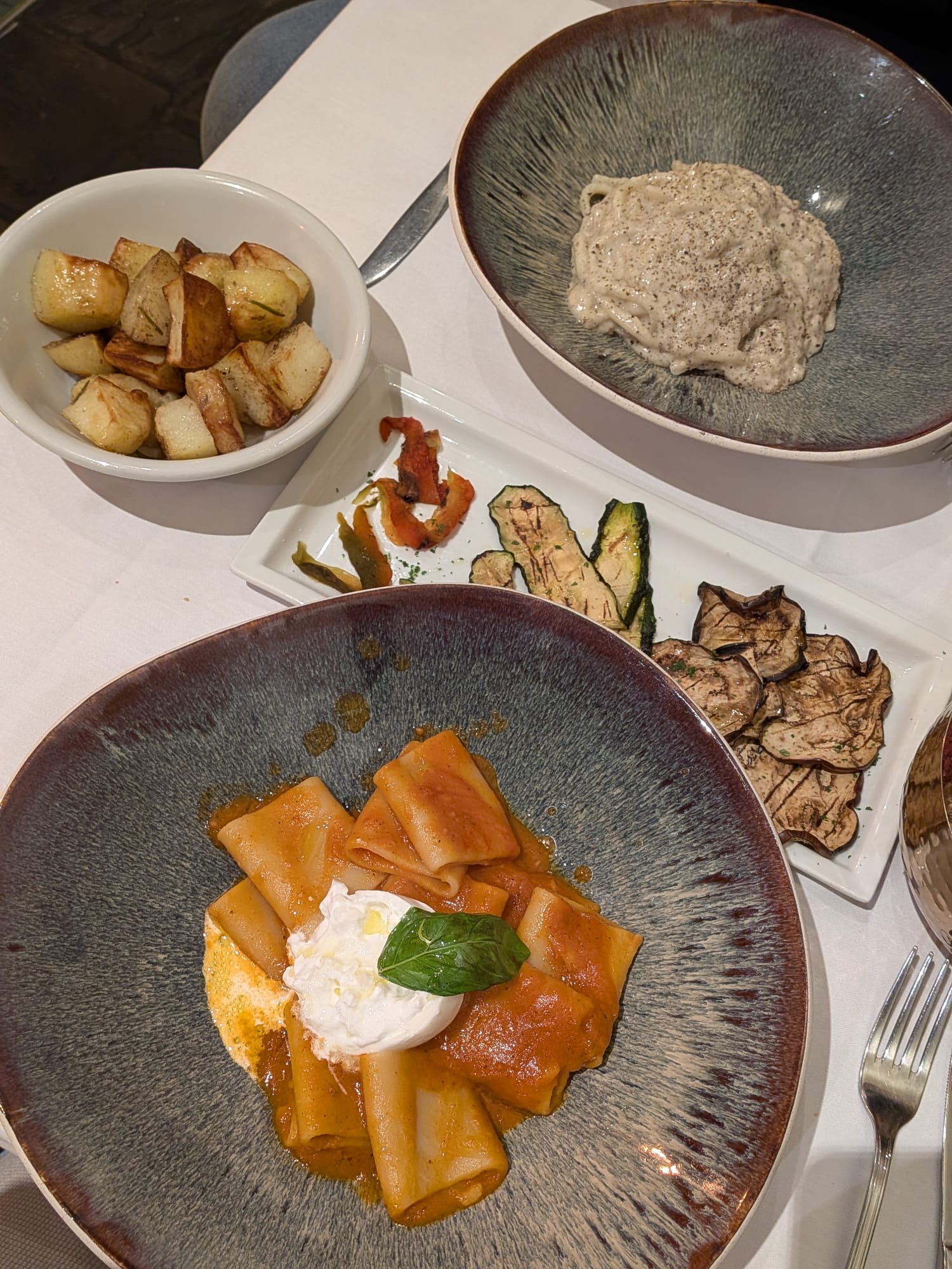 We ordered paccheri with tomato and burrata, and cacio e pepe prepared in a cheese wheel. Both were incredible. Dessert was cheesecake and tiramisu, and by the end, we were very happy.