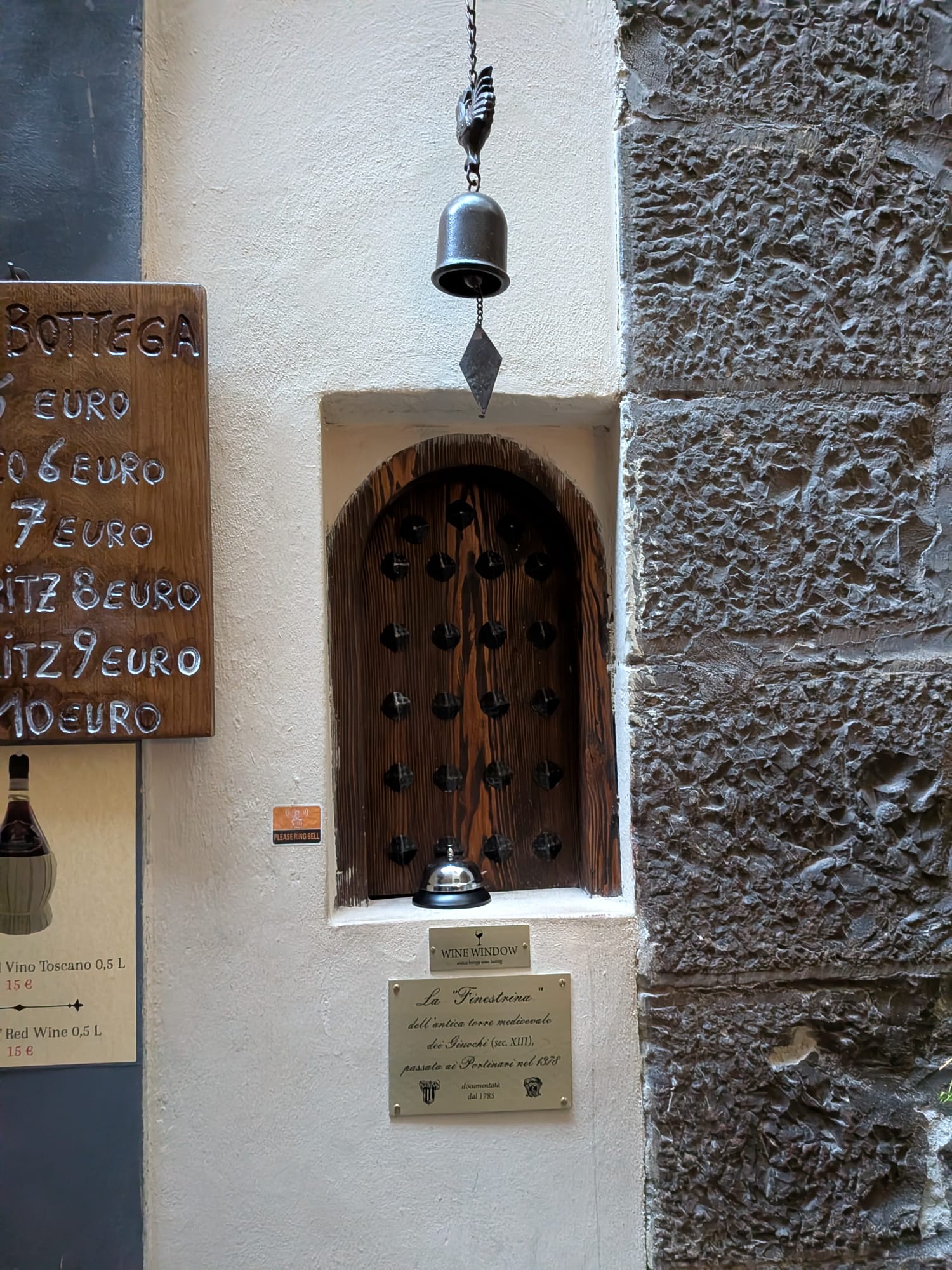 Back in the sixteenth and seventeenth centuries, Florentine families who owned vineyards were allowed to sell wine directly from their homes. You would knock, pass over a flask, and get it filled through the window. During times of plague, they became especially useful since you could buy wine without close contact. Some of these windows are still in use today, which makes them feel less like history and more like something quietly ongoing.